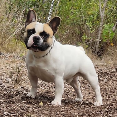 Meet Bronco, our charming standard French Bulldog with a stunning fawn and white coat!This handsome boy boasts a muscular build, perfect ear structure, and a sweet face that's sure to capture your heart. With his healthy constitution and fantastic temperament, Bronco embodies the best of the breed. His adorable light brown face and snowy white body make him a real head-turner.