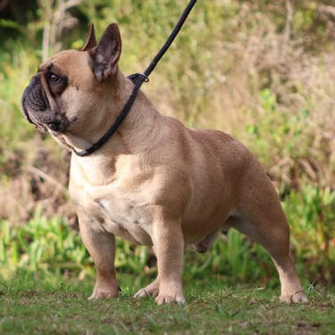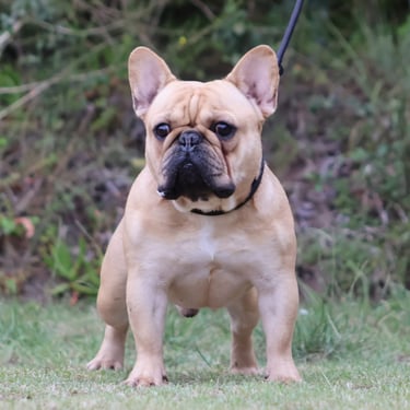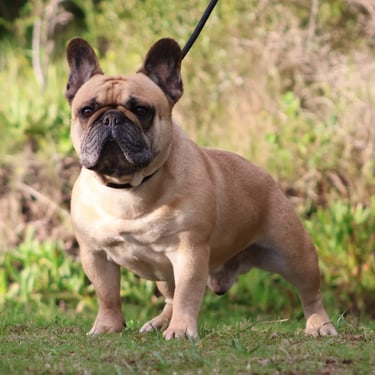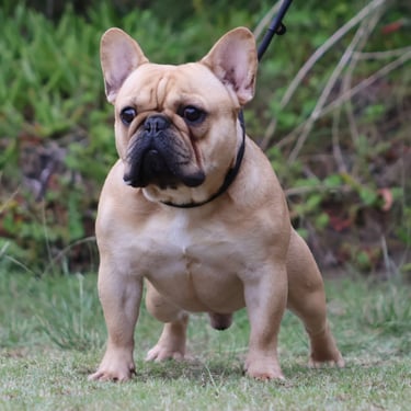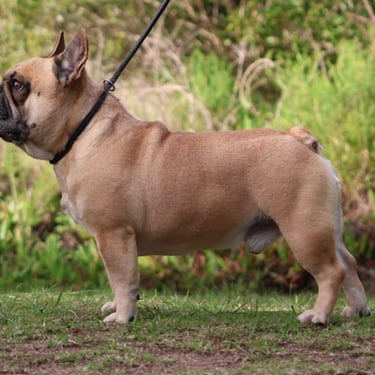 Oscar, our stunning light fawn Frenchie, brings a touch of elegance to our breeding program. With his compact, athletic build and fantastic temperament, he's a standout in every way. We're loving his contribution to our program!